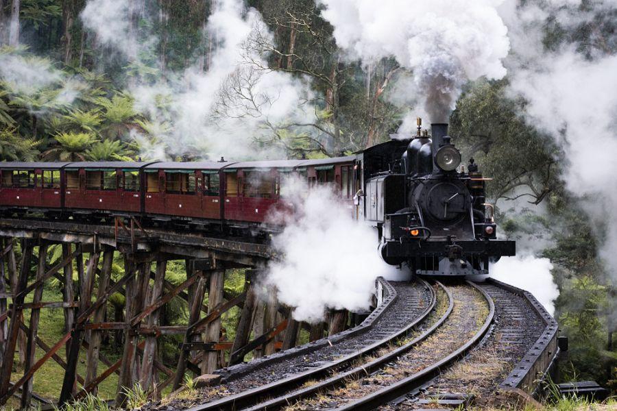 【普芬古董蒸汽火車Puffing Billy】(單程)保存最完整、最具代表性的窄軌蒸汽鐵路之一。列車沿著原始山徑行進,途經雲霧繚繞的森林與高聳的山毛櫸林地,列車側門座位讓乘客能坐在車邊,感受森林氣息輕拂,鐵道蜿蜒跨越木造橋梁與峽谷,風景宛若畫卷一般!