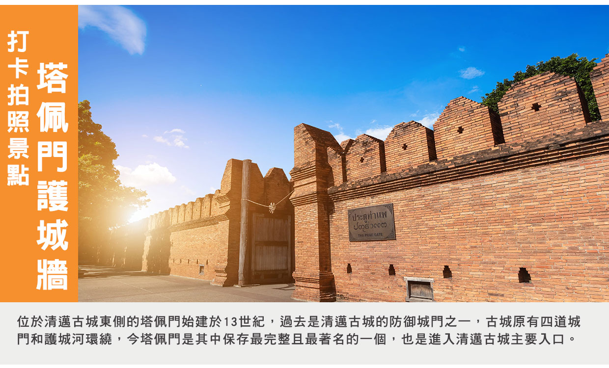 【塔佩門古城牆】塔佩門是清邁古城所遺留下來的唯一遺蹟,古城於1296年所建成。清邁古城建成時,用紅色的磚塊相砌而成的圍牆足足高達兩米,非常氣派。可惜由於經歷風雨和歲月的滄桑,雄壯的清邁古城只留下那道大門作為影子被後人所記住。這座擁有歷史風貌的城門,廣場上的白鴿,經過的行人都會不由自主的將目光聚集在城門前的廣場上。