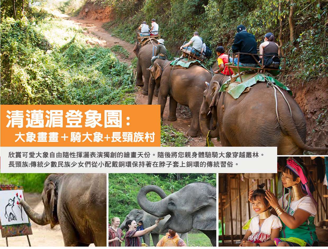 【大象學校MAE TAENG ELEPHANT CAMP】帶各位貴賓來一趟叢林之旅,首先來到大象學校於此參觀工作人員在訓練大小象的工作的情形並觀看他們所安排的精彩大象表演,大象現場作畫表演,欣賞可愛大象自由隨性揮灑表演獨創的繪畫天份。隨後將您親身體驗騎大象絕妙的情趣,穿越叢林,體會古代皇帝用以代步座騎大象,品味越野情趣,此乃是人生一項難得又絕妙的回憶。