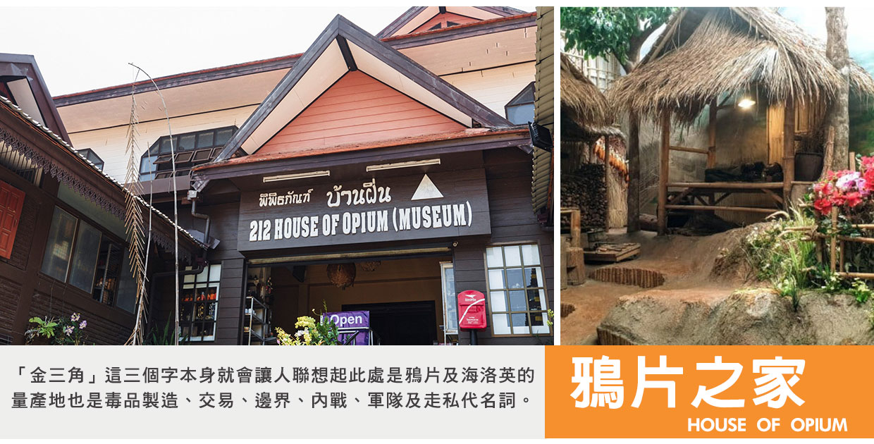 【金三角鴉片之家】此館展現鴉片的來歷,非法毒品的衝擊,並提供給學者研究及探討,深具教育意義。「金三角」這三個字本身就會讓人聯想起此處是鴉片及海洛英的量產地,也是毒品製造、交易、邊界、內戰、軍隊及走私的代名詞。
