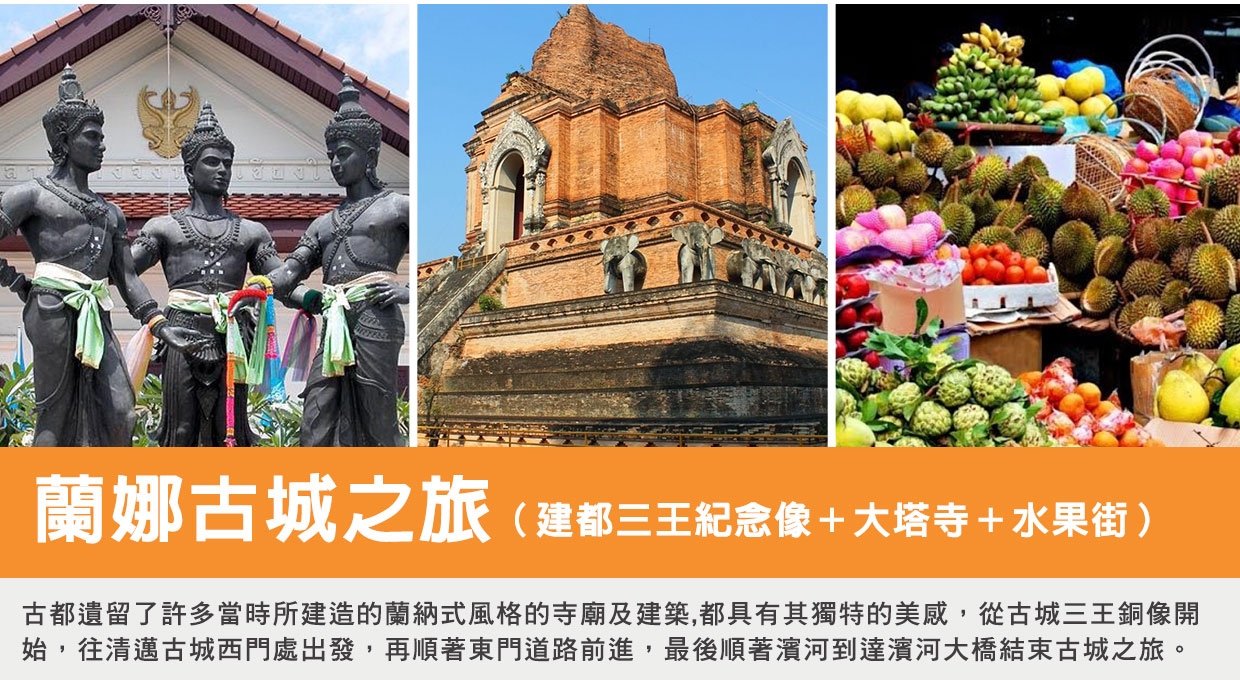 【蘭娜古城之旅】來趟古城之旅,從古城三王銅像開始,往清邁古城西門處出發,由遠而近的觀看清邁著名寺廟之一的帕刑寺,經過古城的西門(花園門),順著護城河往南方向前進,經過南門,清邁南門傳統市場,再次進入古城,到達大塔寺參觀,再順著往東門的道路前進,經過東門廣場,離開護城河城內,順著濱河到達濱河大橋結束這趟古城之旅。