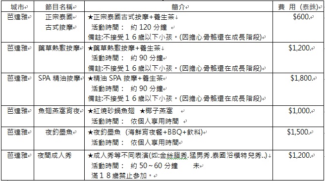 ※以上各項自費活動之收費標準,完全依照泰國觀光局之訂定,各項自費項目絕不強迫,
