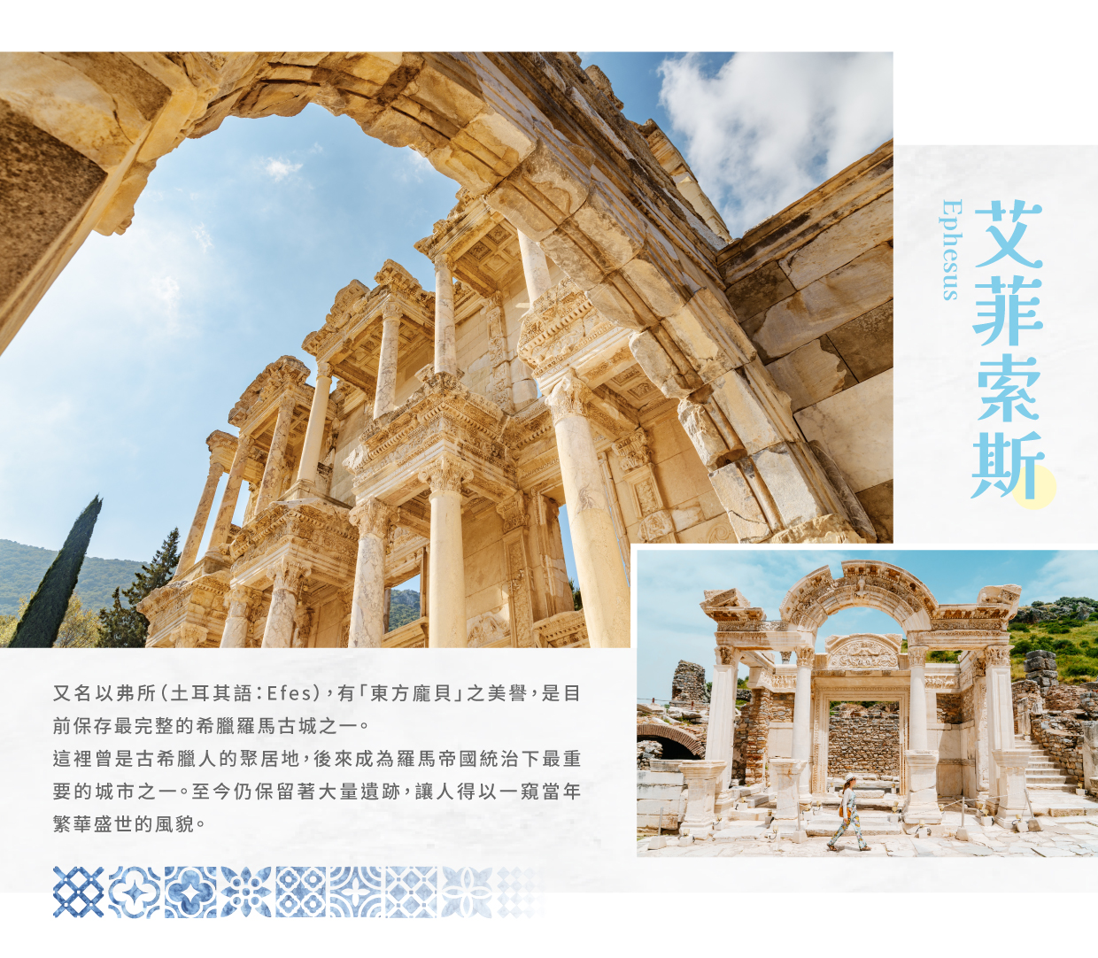 【艾菲索斯 Ephesus】於2015年被聯合國教科文組織 UNESCO 正式列入世界遺產名單。這些遺跡不僅展示了古希臘、羅馬和基督教時期的文化瑰寶,還體現了古代文明的藝術、建築和宗教的重要成就。的遺跡保存相當完整,並且為研究古代城市規劃和文化提供了寶貴的資料,因此成為全球最具吸引力的考古景點之一。每年吸引數以萬計的遊客前來參觀,並成為土耳其重要的文化資產之一。