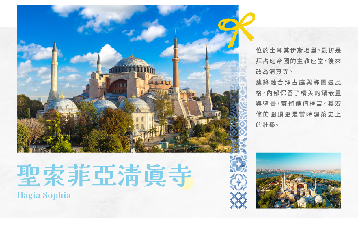 【藍色清真寺 Blue Mosque】藍色清真寺是伊斯坦堡最具代表性的宗教建築之一,建於17世紀,由奧斯曼帝國的蘇丹艾哈邁德一世所命建造。這座清真寺以其宏偉的藍色瓷磚裝飾而聞名,尤其是內部的藍色瓷磚壁畫,讓這座建築在陽光下熠熠生輝。其六座高聳的尖塔和巨大圓頂,讓它在城市天際線中格外突出。這座清真寺是伊斯蘭教徒的禮拜場所,吸引著大量遊客,讓人感受到伊斯蘭建築的獨特美感與文化深度。