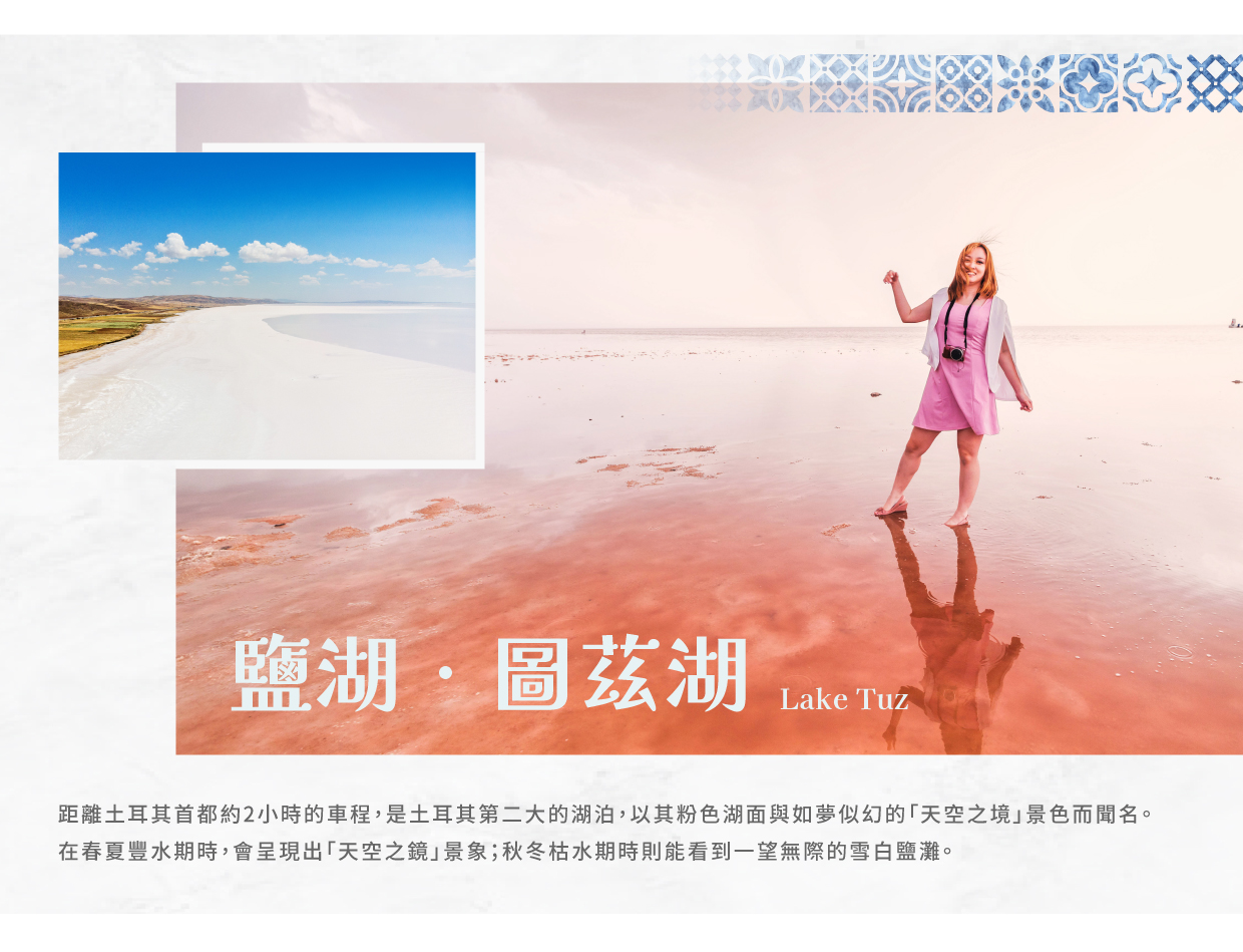 【鹽湖圖茲Lake Tuz】是一片夢幻般的純白大地,位於安卡拉與科尼亞之間,是土耳其第二大湖泊。每到夏季,湖水蒸發後留下大片閃耀的鹽晶,讓整個湖面宛如一面無邊的鏡子。踩在薄薄的鹽層上,天空與大地交融,形成如畫般的景色。這裡還是火烈鳥等候鳥的重要棲息地,為壯麗的白色湖面增添一抹生動的色彩。無論是日出或日落時分,鹽湖都展現出令人屏息的美景,是攝影與放鬆身心的絕佳去處。