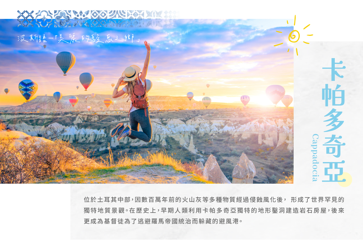 【贈送土耳其最熱門熱氣球之旅 Hot-Air Balloon Cappadocia】卡帕多奇亞熱氣球是來到土耳其不能錯過終生難忘的體驗,這個壯觀的體驗讓你在清晨的第一縷陽光下,乘坐熱氣球飄浮於絕美的喀斯特地形上空。清晨時分,當數百顆熱氣球緩緩升空,金色晨光灑落在奇幻的岩石峽谷與廣闊草原上,彷彿置身童話世界,景色令人屏息。