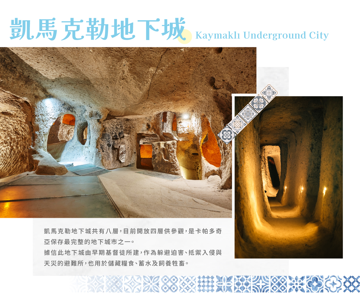 【凱馬克勒地下城 Kaymakli Underground City】是卡帕多奇亞最大的地下城之一,擁有錯綜複雜的通道與深達八層的地下結構。這座地下城市由古代安納托利亞人開鑿,後來成為拜占庭時期居民避難的庇護所。狹窄的石階與隱藏的通道串聯起儲藏室、廚房、酒窖與通風井,展現出當時高超的地下建築技術。石門與秘密通道設計精妙,反映出過去居民為了自衛與生存的智慧。這座地下迷宮至今仍保留著神秘氣息,彷彿帶領人們穿越時空,走進千年前的生活世界。