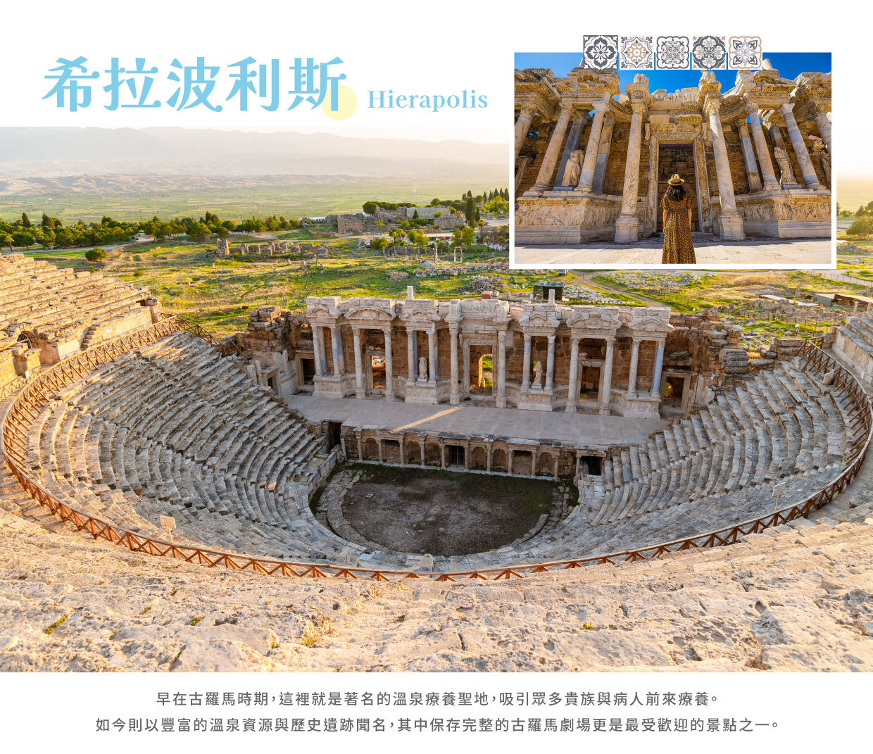 【希拉波利斯遺址 Hierapolis】坐落在棉堡之上,是一座擁有兩千多年歷史的古羅馬溫泉城市。昔日的浴場、神殿與市場,見證了這座城市曾經的繁華與輝煌。宏偉的羅馬劇場保存完好,階梯式座位俯瞰著廣闊的大地,彷彿仍能聽見昔日的歡聲雷動。古代溫泉池「克利奧帕特拉池」傳說是埃及豔后曾沐浴過的地方,池底散落著斷裂的羅馬石柱,增添神秘色彩。漫步於遺跡間,歷史與自然交融,彷彿穿越時光,見證這座古城的榮耀與滄桑。