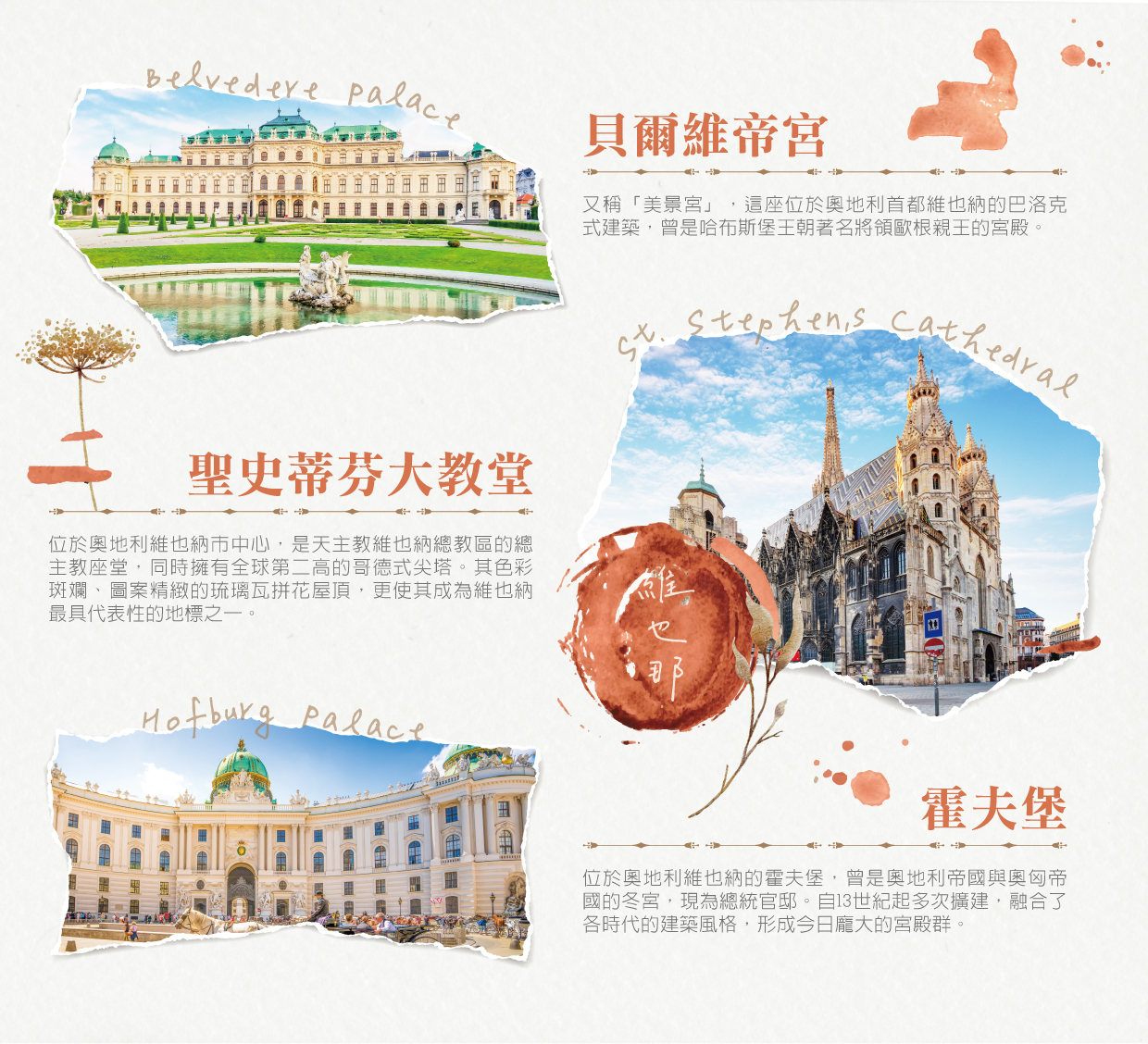 【維也納Vienna】是奧地利的首都,擁有濃厚的文化氣息和悠久的歷史。這座城市融合了華麗的建築和動人的音樂,無論是宏偉的美泉宮,還是富麗堂皇的維也納國立歌劇院,都展現出它的藝術魅力。維也納是音樂之都,曾是莫札特、貝多芬等音樂巨匠的創作基地,這裡的音樂會和歌劇常常讓人陶醉其中。市內的咖啡館文化也頗具特色,悠閒地坐在其中,品味一杯濃郁的維也納咖啡,享受這座城市的優雅氛圍。
