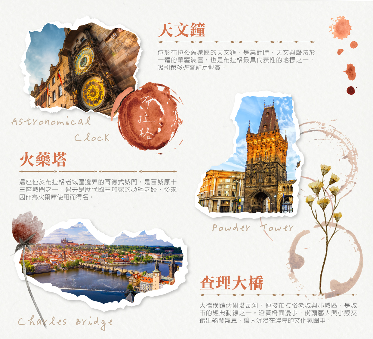 【布拉格Prague】是捷克的首都,也是歐洲最具魅力的城市之一。這座歷史悠久的城市融合了哥德式、巴洛克式和文藝復興風格的建築,街道彷彿流淌著時間的故事。布拉格城堡矗立在城市的最高處,俯瞰著伏爾塔瓦河,提供壯麗的景觀。查理大橋連接著兩岸,成為遊客拍照留念的熱點。老城廣場上有著著名的天文鐘,每到整點時刻,鐘塔上的人偶便會動起來,吸引眾多目光。