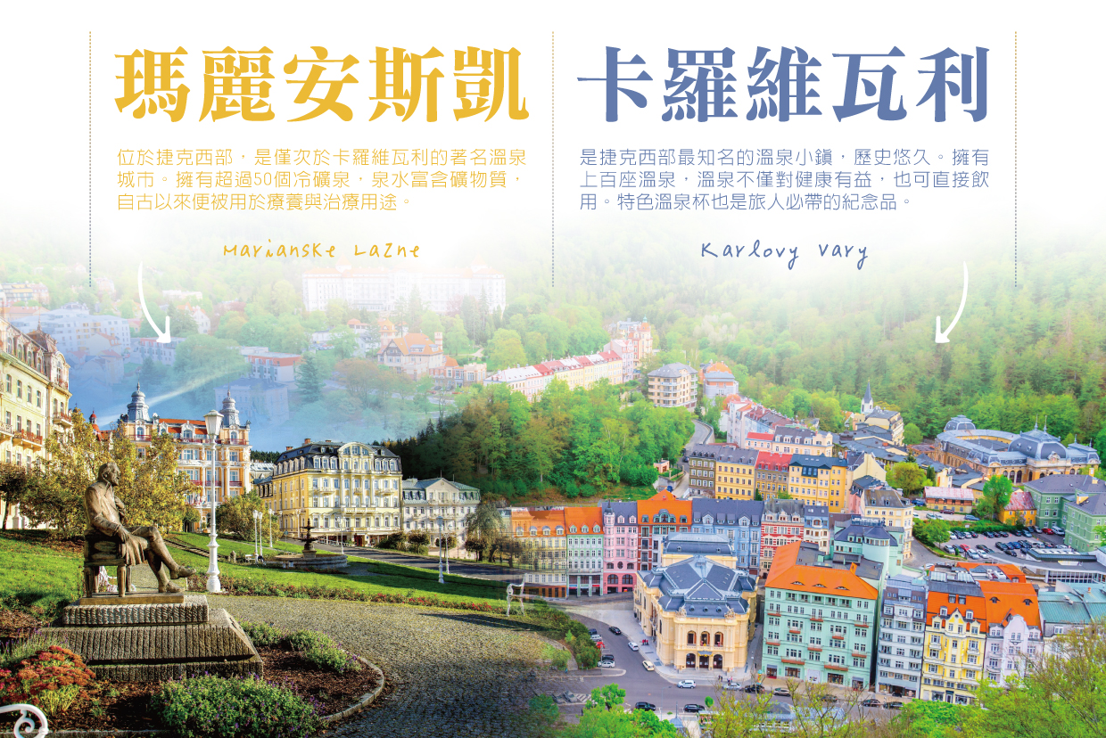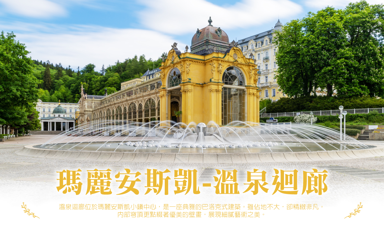 【瑪莉安斯凱Marianske Lazne】(下車參觀)是捷克的一個著名溫泉小鎮,擁有美麗的自然景觀和歷史悠久的溫泉療養設施。這裡的溫泉水質清澈,對健康有益,是許多人來此放鬆身心的理想之地。鎮中的公園、花園與精緻的古典建築相得益彰,彷彿走入一個靜謐的世外桃源。