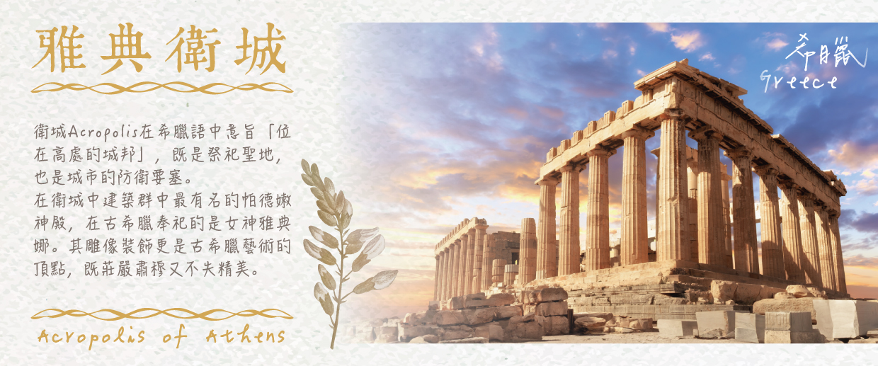 【雅典衛城Acropolis of Athens (入內參觀含官方導遊)】1987年雅典衛城登錄為UNESCO世界文化遺產。被古希臘先知宣稱為神擁有之地,所以一直以來並沒有人居住在那裡。希臘古典時期,神話、宗教、文明在雅典衛城代表希臘一千多年的繁榮與興盛。雅典衛城在這段時期有著三座重要神廟-巴特農神廟、艾瑞克提翁神殿和勝利女神神廟。這三座神廟同樣供奉著雅典娜,但意義卻有不同。巴特農神廟強調的是雅典娜的聖潔,巴特農神廟在衛城建築群中是一個超群的傑作,是古希臘著名建築遺跡的璀璨明珠,有「希臘國寶」之稱,全部由白色大理石建造而成。”艾瑞克提翁神殿” 建於西元前421年,是衛城計劃中最後完成的重要建築。神殿因其形體複雜和精緻完美而著名。供奉的是一尊古老雅典娜神像,最著名的便是它的「女像柱」在古典建築中相當罕見,卡里埃的少女束胸長裙,輕盈飄逸,是這座神殿中最引人注目的地方。勝利女神神廟則強調雅典娜的神力。
