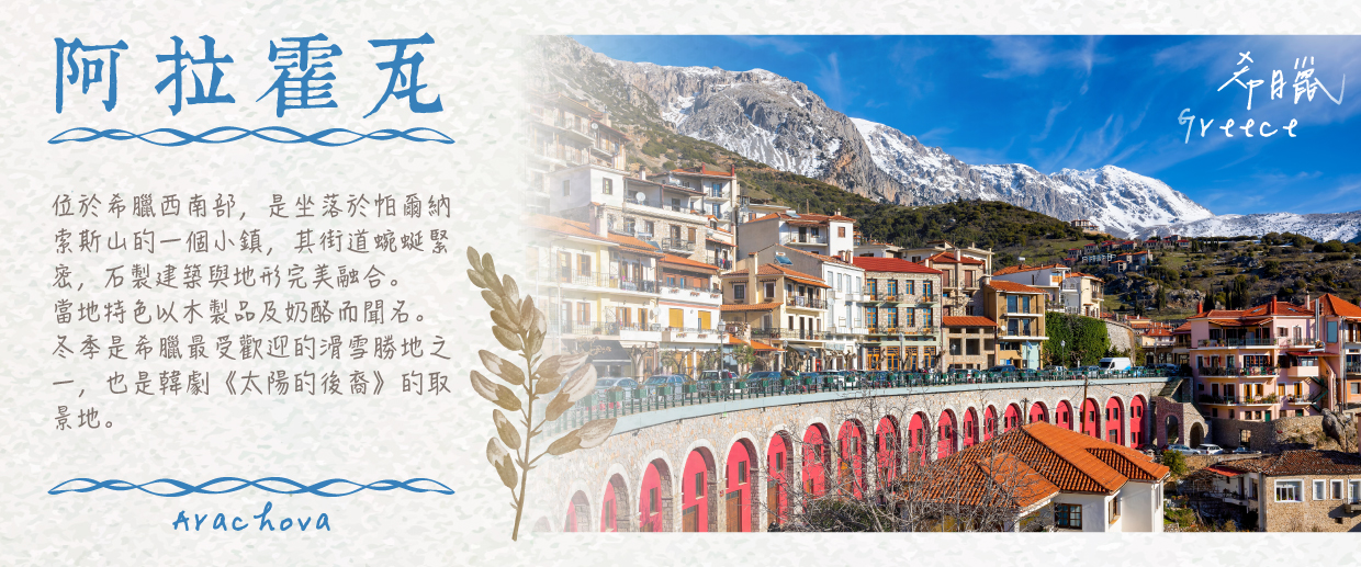 【阿拉霍瓦Arachova】位於帕納索斯山山麓,擁有傳統石屋、新古典建築與蜿蜒的石板街道,散發著濃厚的山城風情。這座海拔約950公尺的小鎮,被譽為“希臘的天空之城”,以其清新的空氣與壯麗的山景吸引眾多旅人。 鐘塔是小鎮的地標之一,登上後可俯瞰整個阿拉霍瓦與遠處的群山,景色如詩如畫。當地還盛產美味的羊奶乳酪、葡萄酒與手工編織地毯,滿載著希臘傳統文化的獨特風味。 在這座充滿寧靜與魅力的小鎮,旅人可以感受希臘山區的質樸風情與自然之美,享受一場心靈上的放鬆之旅。