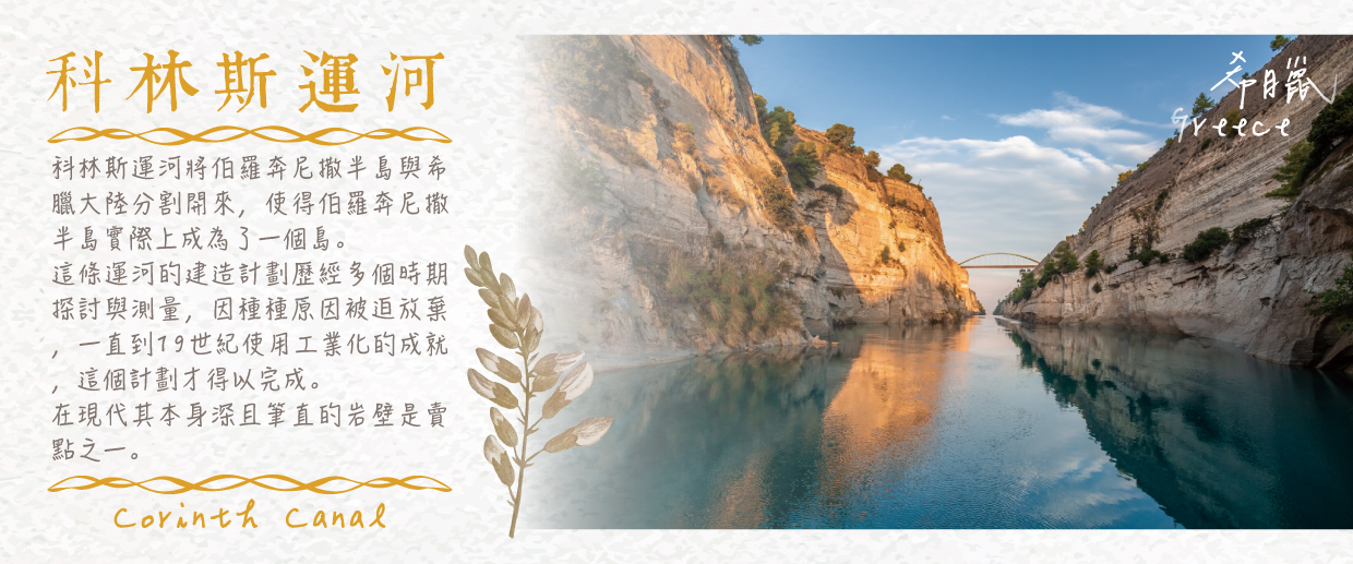 【科林斯運河Corinth Canal】科林斯運河連接薩羅尼克灣與科林斯灣,全長約6.3公里,兩側高達80公尺的峭壁形成壯觀的峽谷景緻。這條運河自1893年開通以來,大幅縮短航行時間,是古老願景與現代工程的完美結合。站在橋上俯瞰,陡峭深邃的景象讓人屏息,而藍色運河水流映襯峽谷,更顯壯麗震撼。