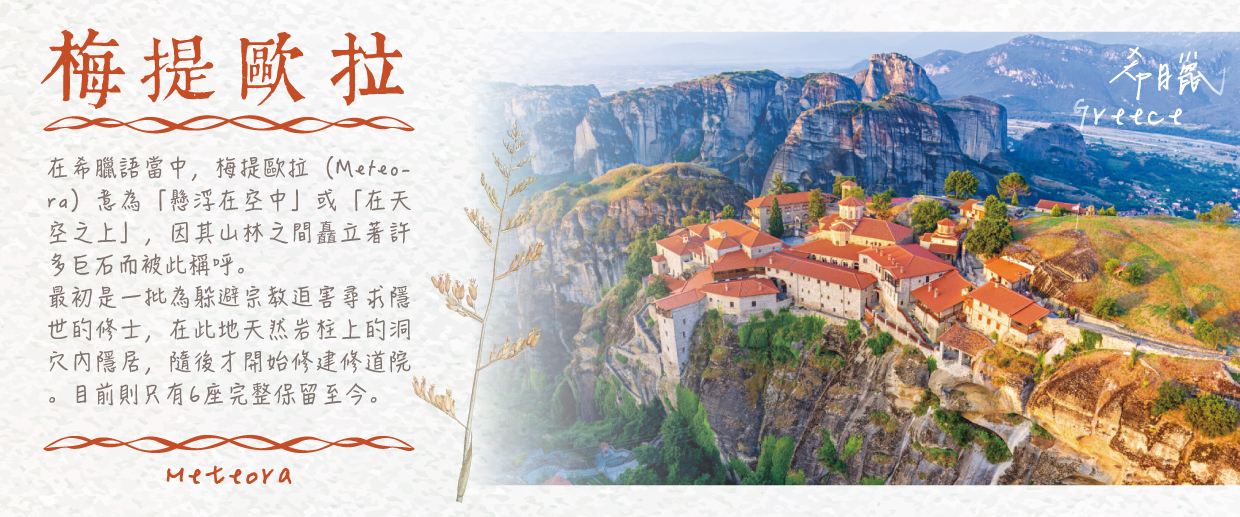 【梅提歐拉修道院之旅】(入內參觀含持牌官導)「天空之城」梅提歐拉最為人嚮往的莫過於建蓋在高聳巨石上的修道院,據說,14世紀時塞爾維亞人入侵了色薩利地區,大批修行者為了逃避動亂,來到梅特歐拉而這裡的修士們潛心修行,各自過著與世無爭的生活;梅提歐拉目前有24座修道院,但僅其中6座上保存完整,這6座修道院分別為此區海拔最高且占地最大的修道院-梅提歐拉修道院、聖尼可拉斯修道院、瓦爾拉姆修道院、曾電影007拍攝場景之一的聖三一修道院、有最美女子修道院之稱的魯桑奴修道院以及聖史蒂芬諾斯修道院;團體將視修道院的開放時間與日期入內參觀2座,修道院內部陳設雖大同小異,但因海拔與方位各不相同不同,使每座修道院都可觀賞到不同的景緻,每一幕的壯闊景觀皆讓人驚嘆連連。