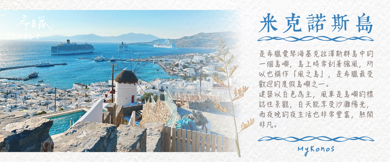 【米克諾斯島Mykonos】是希臘最著名的度假勝地之一,位於愛琴海中心,以其迷人的海灘、白色建築與藍天相映成趣的風光聞名。這座島嶼擁有悠久的歷史與現代的活力。米克諾斯的迷人魅力體現在其古老的街道與現代化的夜生活之間的和諧共處。遊客可以在小威尼斯區漫步,欣賞海景並享受當地的美食。米克諾斯的風車是島上最具標誌性的建築之一,這些古老的風車俯瞰著藍色海洋,見證著島嶼的歷史與文化。