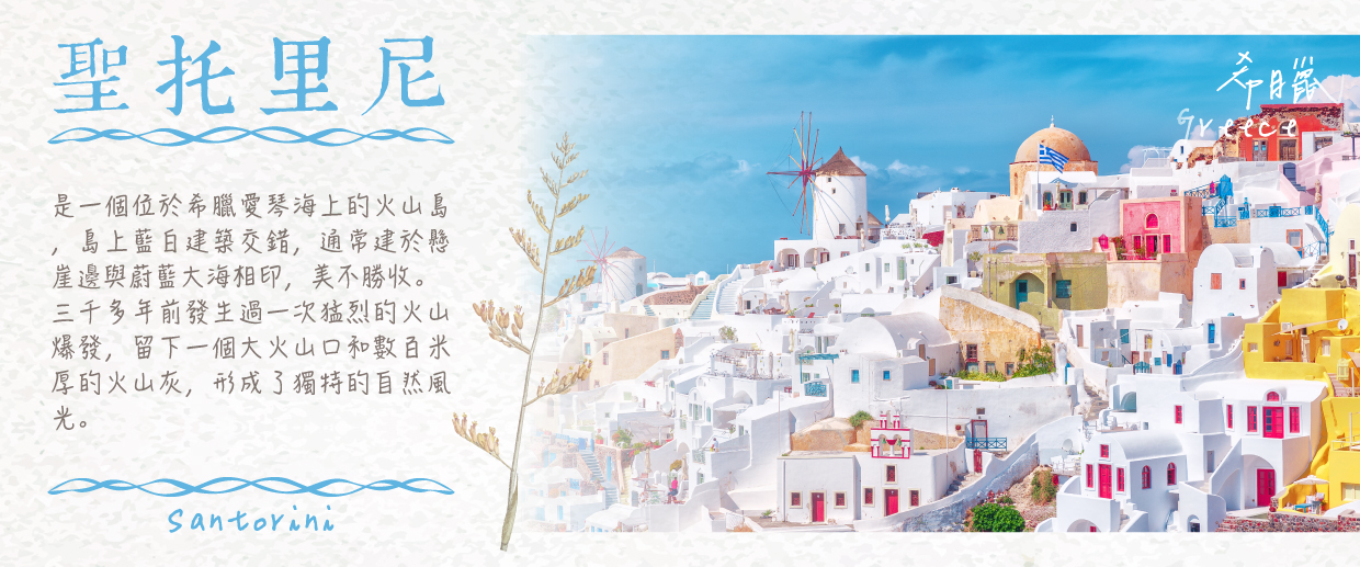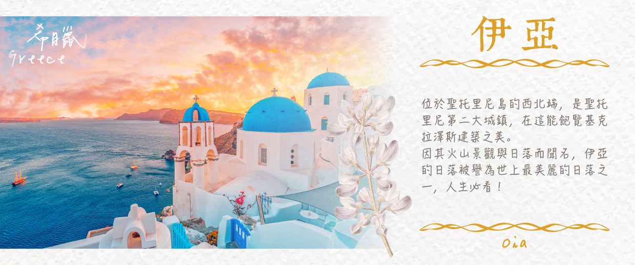 【藝術小鎮伊亞Oia】聖托里尼島北邊岬角的頂端有個名叫伊亞的小鎮,它是聖托里尼島的第二大城鎮,也是愛琴海上出鏡最多的地方。多數遊客來這裡的主要目的就是欣賞這裡的日落。據說這裡是全世界最美麗的日落,能看到「夕陽落入愛琴海」的獨特景觀。伊亞小鎮的日落景色被許多藝術家、攝影家作為靈感的來源。每年有好幾百萬的遊客到這個基克拉澤斯群島上的半彎月形火山島來度蜜月,享受愛琴海令人陶醉的氣氛. 同時也選擇居住在這島上,感受拉小鎮的美,漫步享受藍白色的浪漫風情,許多情人都在這裡留下愛的足跡。