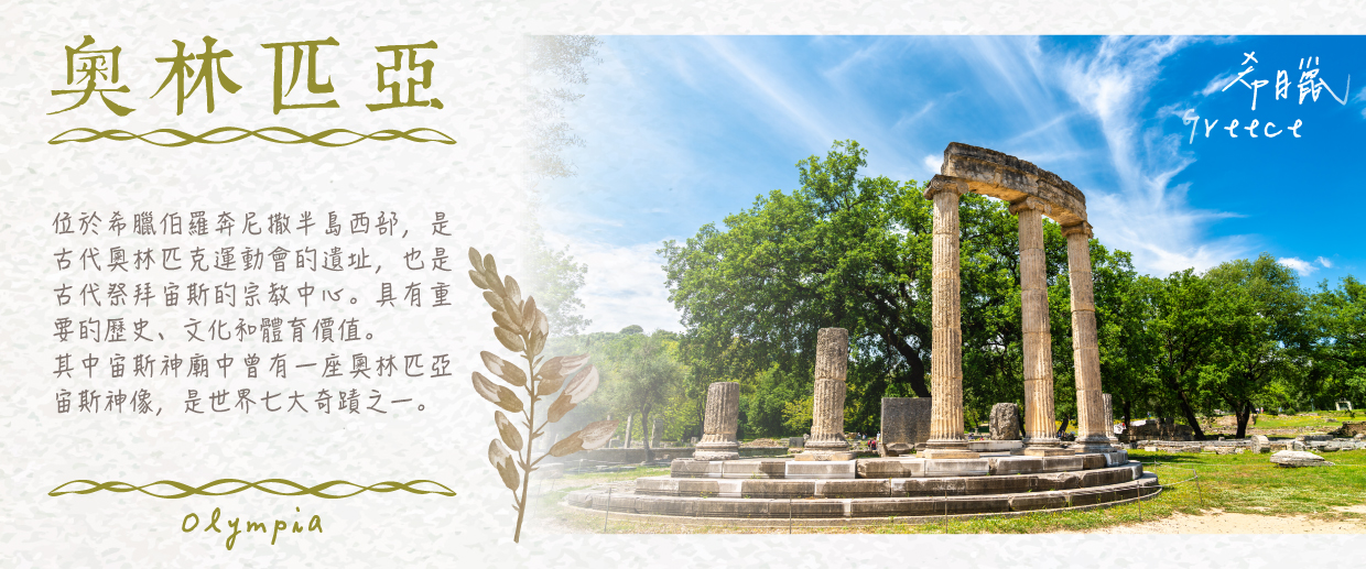 【奧林匹亞Olympia】是古希臘奧運會的誕生地,承載著超過千年的歷史與榮耀。這座神聖之地曾是古希臘祭祀宙斯的中心,今日則以壯觀的遺跡群吸引著無數遊客。 漫步於奧林匹亞遺址,您將看到雄偉的宙斯神廟遺跡,這裡曾矗立著古代世界七大奇蹟之一高達13公尺的宙斯金像。此外,保存良好的古奧林匹克運動場依然傳遞著當年的熱血與榮耀,讓人彷彿聽見選手們的呐喊與觀眾的歡呼。(外觀)