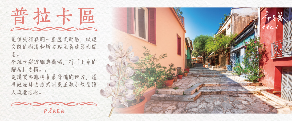 【普拉卡區Plaka Old Town Area】是購買希臘特產最齊備的地方,包括穿傳統希臘服裝的娃娃、金銀飾品、皮製品、橄欖香皂、天然海綿、香膏等等,還有幾座拜占庭式的東正教小教堂點綴其中,總讓遠道而來的旅人們流連其中。普拉卡徒步區除了是購物天堂之外也是美食天堂,在這裡不必擔心找不到東西吃,舉凡各種地中海傳統美食、咖啡廳、高級餐廳等一應俱全,來到這裡一定要多方品嘗各種不同的異國料理喔。