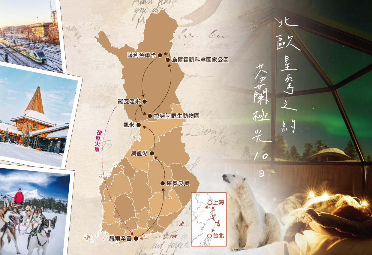 貴賓們今日集合於桃園國際機場,搭乘豪華客機經上海轉機,前往夢幻迷人的北國──芬蘭。這片宛如童話世界的國度,以潔白雪景、絢爛極光與純淨自然聞名於世,靜靜等待著我們展開一場溫暖而感動的北歐之旅。