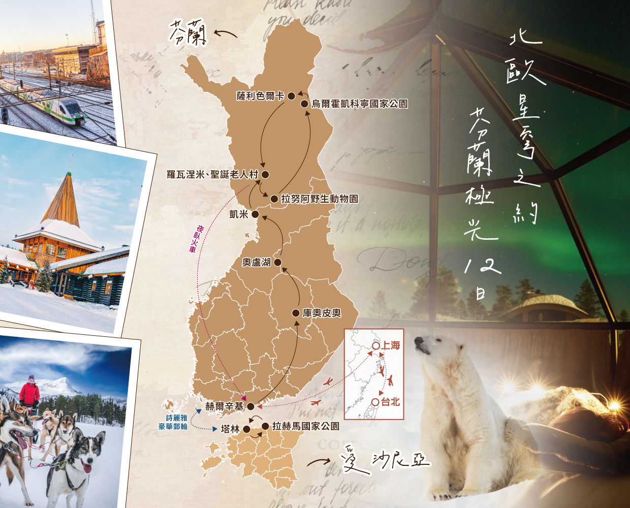 貴賓們今日集合於桃園國際機場,搭乘豪華客機經上海轉機,前往夢幻迷人的北國──芬蘭。這片宛如童話世界的國度,以潔白雪景、絢爛極光與純淨自然聞名於世,靜靜等待著我們展開一場溫暖而感動的北歐之旅。