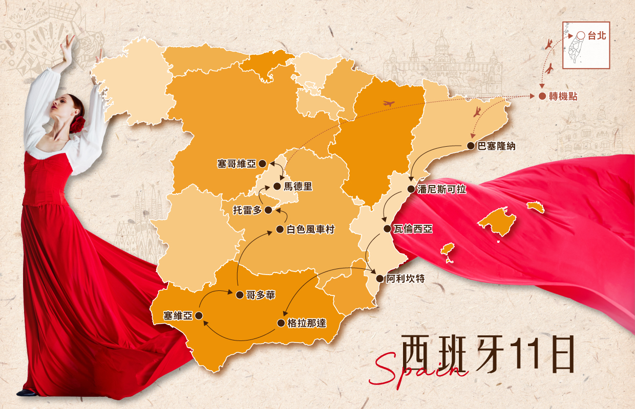 貴賓們今日齊聚桃園國際機場,搭乘豪華客機飛往熱情洋溢的西班牙。這個國度以世界遺產聞名,擁有從摩爾建築到哥德式教堂的輝煌遺跡,也有現代藝術與浪漫風情交織的城市魅力。高第的夢幻建築、歷史悠久的古城、熱情奔放的弗拉門戈與繽紛多彩的節慶,都展現出西班牙獨有的靈魂。這趟旅程將帶領我們穿梭在文化與藝術的殿堂之中,感受陽光、熱情與濃厚的地中海氣息,開啟一段難忘的南歐盛宴。