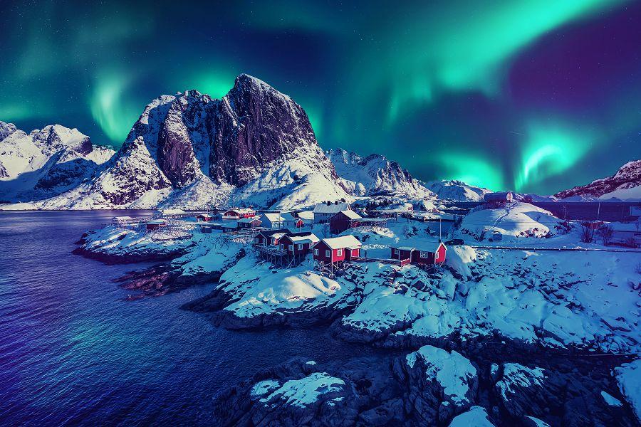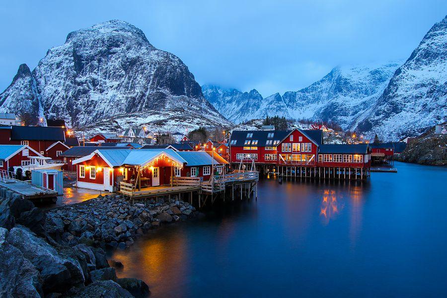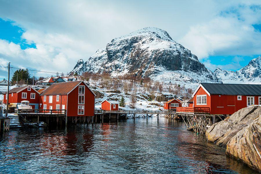 【哈姆諾伊漁村Hamnoy】是羅浮敦群島最古老的漁村之一,也被譽為「世界最上鏡的村落」。紅色漁屋依偎在峭壁與海灣之間,背後是陡峭山峰,前方是靜謐的碧藍海水,構成一幅完美的北極畫卷。 這裡的景色因太過經典,曾登上《孤獨星球》封面,成為全球旅人心中最嚮往的北歐畫面。