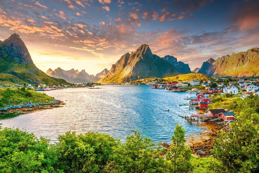 【努斯峽灣Nusfjord】是挪威保存最完整的傳統漁村之一。這座小漁村因峽灣地形得名,最早可追溯至數百年前的捕魚歷史,曾是北大西洋鱈魚捕撈的重要據點。村中一排排紅色與黃色的木造漁屋依山傍海而建,倒映在清澈海水之中,畫面如同走入北歐油畫。漫步在木棧道上,可以看到仍保存的古老魚油廠、碼頭與小型商舖,完整呈現出傳統挪威漁村的生活樣貌。今日的努斯峽灣被列入挪威文化遺產。