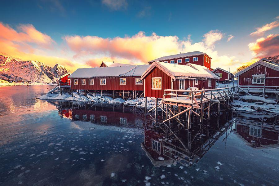 特別安排【傳統海畔漁屋Rorbuer】挪羅浮敦群島最具特色的住宿體驗,莫過於入住傳統的紅色漁屋。這些木造小屋原本是供遠道而來的漁夫在鱈魚季節落腳的臨時住所,如今經過整修與改建,成為別具風情的旅宿。木屋大多依海而建,推窗即可望見峽灣、漁船與遠方山巒,日出時海面泛著金光,夜晚則有機會仰望星辰或極光,氛圍浪漫而純淨。屋內保留木質結構,搭配現代化設備,既有溫馨懷舊的氣息,又兼顧舒適便利。