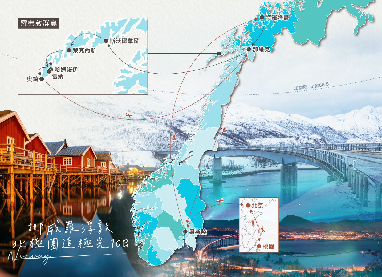貴賓們今日集合於桃園國際機場,搭乘豪華客機飛往北歐心臟──挪威。從首都奧斯陸展開旅程,這座峽灣門戶與藝術之都,將帶領我們踏入北歐的文化氣息。接著前往夢幻的羅浮敦群島,遠離塵囂的純淨北境,宛如詩畫的漁村、雪山、峽灣與海岸線,構成最動人的北極場景。