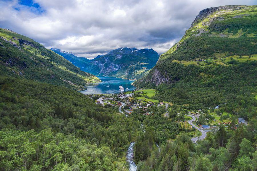 【赫勒敘爾特Hellesylt】是世界著名的蓋倫格峽灣入海口小鎮,被群山與峽灣環抱,風光秀麗。這座小鎮雖然規模不大,卻是遊船進入峽灣的重要門戶。鎮上最具代表性的景觀是赫勒敘爾特瀑布,奔騰水流自城鎮中央傾瀉而下,穿過石橋與屋舍之間,畫面壯觀而迷人。