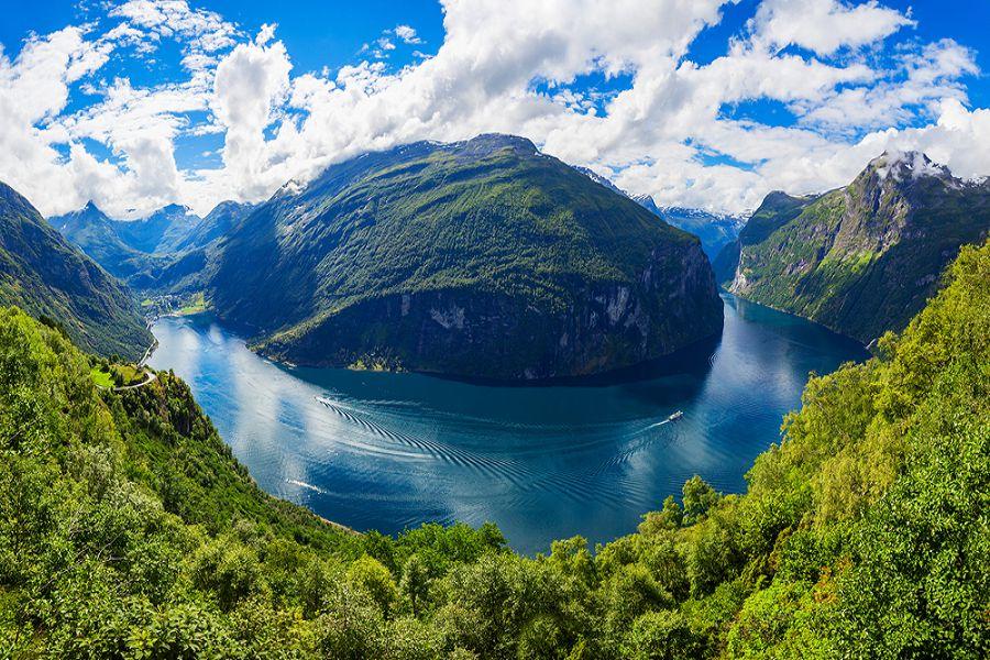 【蓋倫格峽灣Geirangerfjord】全長約15公里,被列入UNESCO世界自然遺產,是挪威峽灣中最壯麗與最具代表性的一條。兩岸山峰高達1,000公尺以上,峽灣最深處則有250公尺,形成氣勢磅