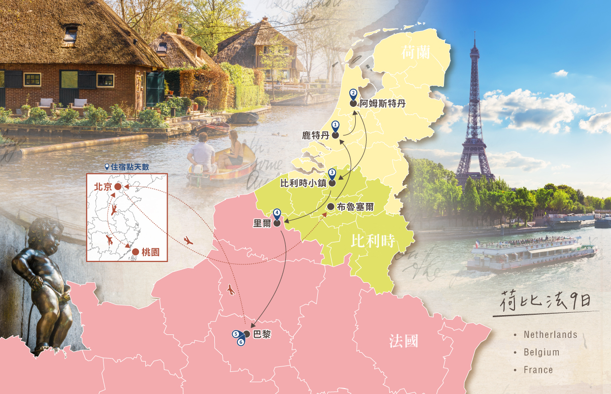 貴賓們今日集合於桃園國際機場,搭乘豪華客機飛往歐洲心臟──比利時布魯塞爾。旅程將由這座融合中世紀風情與現代藝術的城市揭開序幕,漫遊荷蘭詩意盎然的運河風光,走訪比利時保存完好的古城街巷,最終前往浪漫優雅的法國巴黎返程。一路飽覽歐洲經典建築與動人景致,細細體會各地獨特的人文氣息與生活節奏;從歷史古都到時尚之都,從石板街道到藝術大道,荷比法以深厚的人文底蘊與浪漫氛圍,交織出一段令人回味的歐洲樂章。