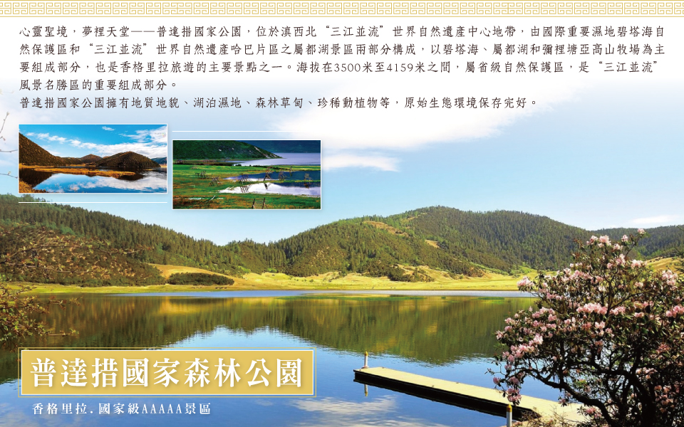 【普達措國家森林公園】位於雲南省迪慶藏族自治州香格里拉市建塘鎮紅坡村,處於滇西北“三江並流”世界自然遺產中心地帶,距香格里拉城區22千米,總面積約1313平方千米,按7大板塊進行開發,由國際重要濕地碧塔海自然保護區和“三江並流”世界自然遺產哈巴片區之屬都湖景區兩部分構成,以碧塔海、屬都湖和彌裡塘亞高山牧場為主要組成部分。 公園範圍內最高點海拔4670米,最低點海拔2347米,有多處斷層崖、林間小澗、深溝峽谷等獨特小景交錯分佈,包含了較為原始完整的森林灌叢、高山草甸、濕地湖泊、地質遺跡、河流峽谷生態系統等。 2012年11月26日,被授予國家5A級旅遊景區。