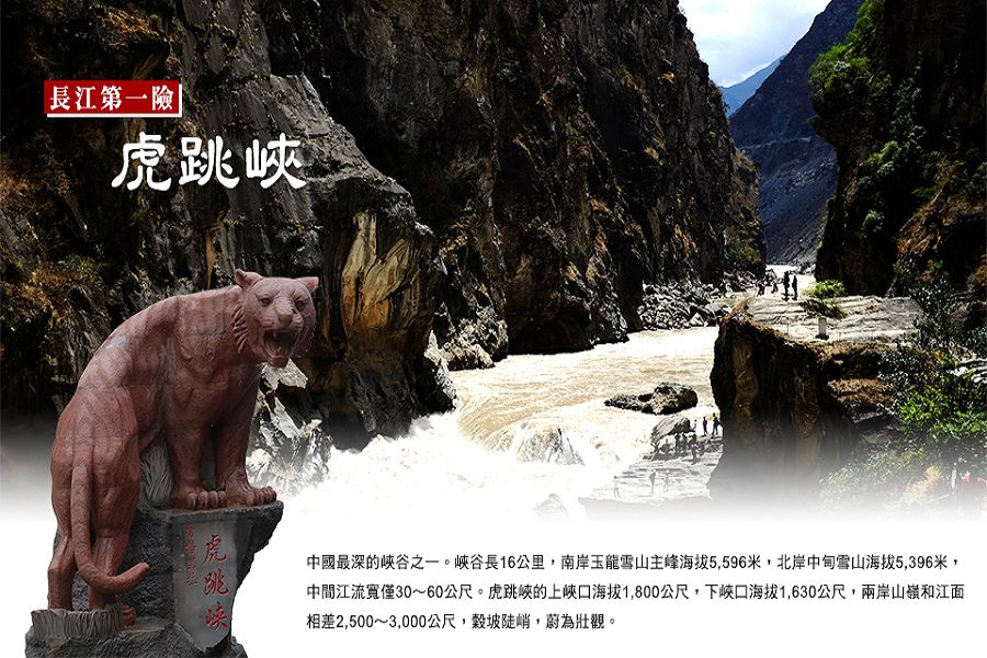 【虎跳峽景區】位於雲南省迪慶藏族自治州香格里拉市虎跳峽鎮,分為上虎跳、中虎跳、下虎跳三段,是中國最深的峽谷之一。虎跳峽景區南岸的玉龍雪山海拔5596米,臨峽一側山體陡峭,幾乎是絕壁,無路可尋;北岸的哈巴雪山海拔5386米,臨峽一側山坡稍緩,這一側有一條簡易的碎石公路,貫通全峽,公路上方還有一條步行小路。受兩岸高山的緊緊束縛,江流入峽後寬僅50多米,最窄處虎豹一躍即過,故名虎跳峽。峽谷距離麗江市市區80千米,峽谷在金沙江上游,全長17千米,迂回道路25千米,峽谷垂直高差3900多米,是世界上最深的峽谷之一。虎跳峽景區氣候屬溫帶和寒溫帶季風氣候,年平均氣溫4.7℃—16.5℃,年極端最高氣溫25.1℃,最低氣溫-27.4℃。立體氣候明顯,有“一山分四季,十裡不同天”的說法。虎跳峽景區裡的虎跳峽峽口海拔1800米;虎跳峽全長23千米,落差213米,海拔高差3596米以上。虎跳峽上峽口與下峽口相距僅16千米,落差達220米,平均坡降達13. 8%,是金沙江落差最集中的河段。峽內江面不足海拔1800米,峰谷間高差達3000余米。峽中谷坡陡峭,懸崖壁立,呈幼年期“V"形峽谷地貌。曾因山崩截流,今巨石遺留,致使水勢更加洶湧。2009年6月,虎跳峽景區通過國家旅遊局評定,成為國家4A級景區。