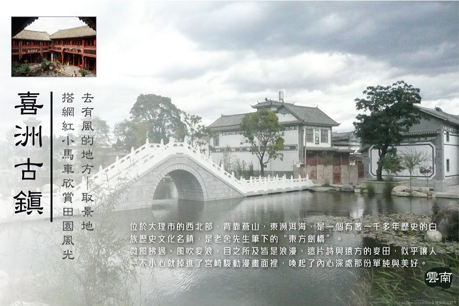 【喜洲古鎮】位於大理古城以北18公里處,東臨洱海,西枕蒼山,喜洲是重要的白族聚居的城鎮,這裡有著保存最多、最好的白族民居建築群。從佈局上看是典型的“三坊一照壁”及“四合五天井”的白族庭院格局。這些民居雕樑畫棟、斗拱重疊、翹角飛簷、門樓、照壁、山牆的彩畫裝飾藝術絢麗多姿,充分體現了白族人民的建築才華和藝術創造力。古鎮的街道都是石板鋪成,有許多保存完整的百年老院,位於雲南省大理白族自治州,是滇西著名的歷史文化古鎮,以白族傳統建築、千年歷史底蘊和濃鬱民俗風情聞名。