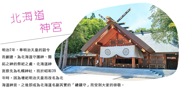 【北海道神宮】參觀,神宮為明治2 (1869) 年9月1日,奉明治天皇的詔令而創建,為北海道守護神、開拓之神的祭祀之處。北海道神宮原先為札幌神社,而於昭和39 (1964)年時,因為增祀明治天皇而改名為北海道神宮,之後即成為北海道名副其實的「總鎮守」(總守護神)而受到大家的崇敬。