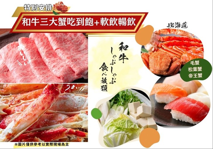 晚餐: 三大螃蟹吃到飽+和牛涮涮鍋吃到飽+酒精飲料喝到飽(80分鐘)