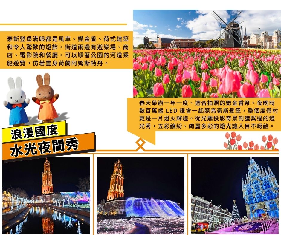 【豪斯登堡】豪斯登堡是長崎縣的主題樂園,園內設計全部仿造中世紀的荷蘭景象造鎮。遊樂園的名稱是以荷蘭皇室家族的宅邸名稱來命名。園內有如詩如畫的運河風光、頗具象徵性的風車以及優美的庭園及建築,到處都瀰漫著歐洲風情。季節性花卉更為遊樂園增添不少魅力。旅客可以在遊樂園內欣賞美麗的自然風光、遊覽景點、從眾多餐廳中挑選一間餐廳品嘗美食,還可以搭乘觀光遊艇暢遊園內運河。遊樂園還會依據不同季節舉辦各種活動,例如春季時的鬱金香賞花祭和夏季的煙火競賽等。主題樂園區重建的荷蘭造型建物內會舉辦各種活動。其中有許多是以3D投影科技構成的現代劇院。此外,還有鬼屋、鏡面迷宮及摩天輪,烏特勒支區內仿造德姆特倫高塔的高塔城上還有360度全視野的觀景台。港口區內的主要遊樂設施是劇院及模仿豪斯登堡宮殿的華麗建物,宮殿內還有美術館。