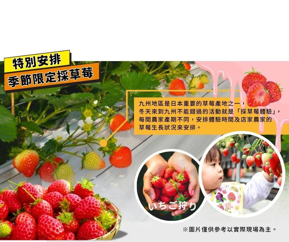 【採草莓】特別安排九州當地果園,體驗現採現吃的草莓樂趣!當季香甜多汁的草莓任您享用,是旅途中最受歡迎的人氣活動之一。適合親子、情侶或好友同遊,留下最甜美的旅行回憶!