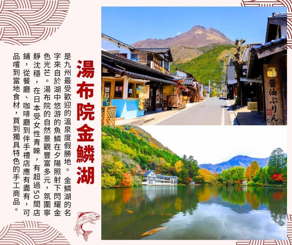 【湯布院】湯布院是分佈在大分川的源流之地---由布院盆地中心的鄉鎮,盆地北側有知名的稱爲豐後富士的由布嶽。自古以來,老式旅店與別致的洋式私人旅館、有個性的美術館與小型展覽室、高級酒樓與茶室相處並存,構成一種優雅的氣氛。