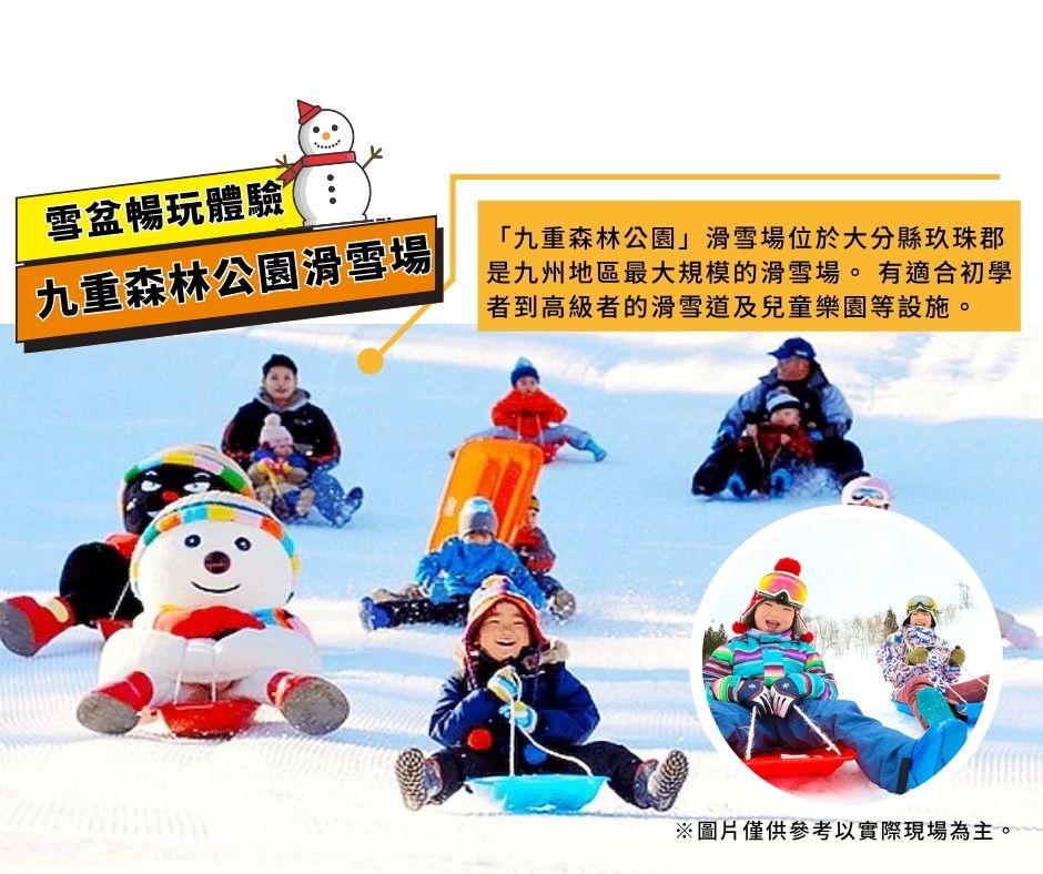 【九重森林公園滑雪場】在氣候較炎熱的九州裡,位於大分縣的九重森林公園滑雪場是九州最大型的滑雪場,擁有不同難度的滑雪道及不同設施可供各個年齡層遊玩,在此本公司特別安排雪盆暢玩體驗!