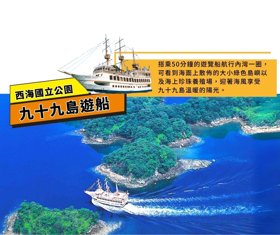 【九十九島遊覧船】九十九島是指佐世保灣外側向北到平戶的25km的海域。在這複雜的海域幾乎全區域都被指定為「西海國立公園」,島的密度被稱為日本第壹。在此本公司特別安排九十九島遊覽船珍珠皇后號或未來號,帶您遊覽長崎縣佐世保港外的「九十九島」地區超過200座的美麗小島。