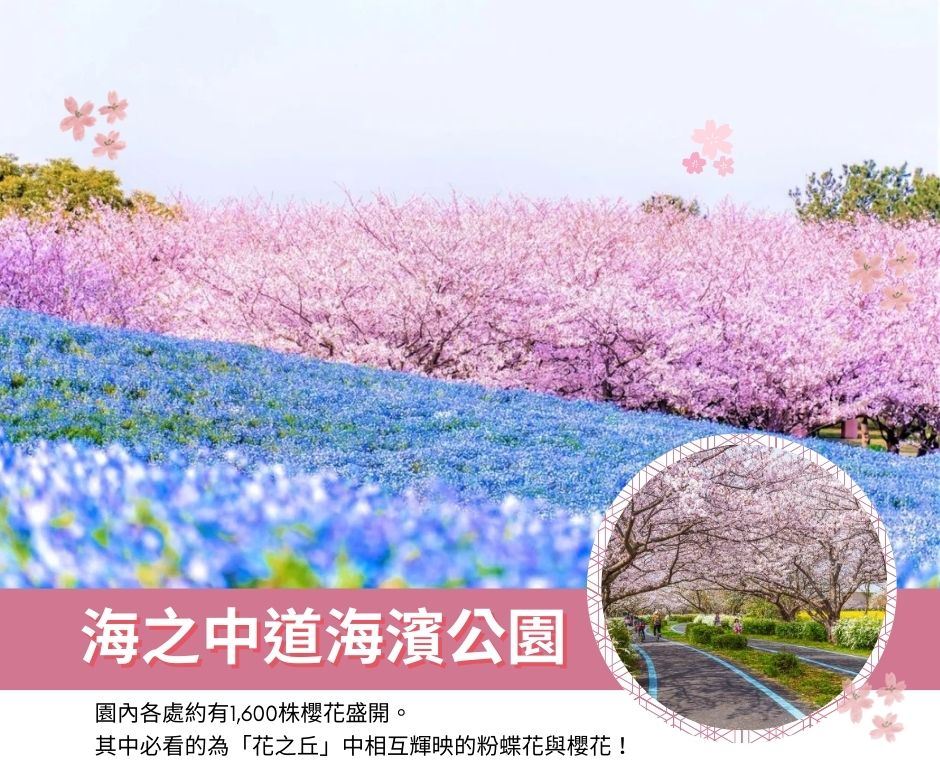 【海之中道海濱公園】在櫻花季時,約有1600棵櫻花樹盛開,特別是染井吉野櫻和大島櫻,沿著自行車道形成美麗的櫻花隧道,讓人彷彿走入童話世界。 此外,公園內的花之丘還會同時綻放約150萬株粉蝶花,藍色花海與櫻花相互輝映,形成獨特的視覺饗宴。