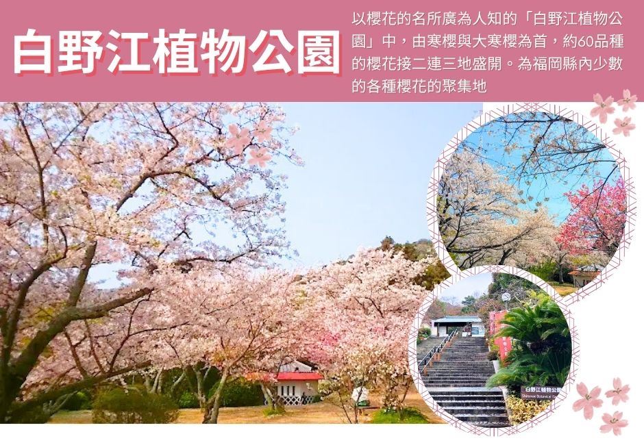 【白野江植物公園】是北九州市的賞櫻名所,以其多樣化的櫻花品種和美麗的景觀而聞名。 園內有約60種,800多株櫻花樹,包括早開的寒櫻、河津櫻,以及染井吉野櫻等,讓遊客可以從2月下旬一直欣賞到4月下旬。 其中,樹齡500年的「白野江里櫻」更是被指定為福岡縣的天然紀念物。