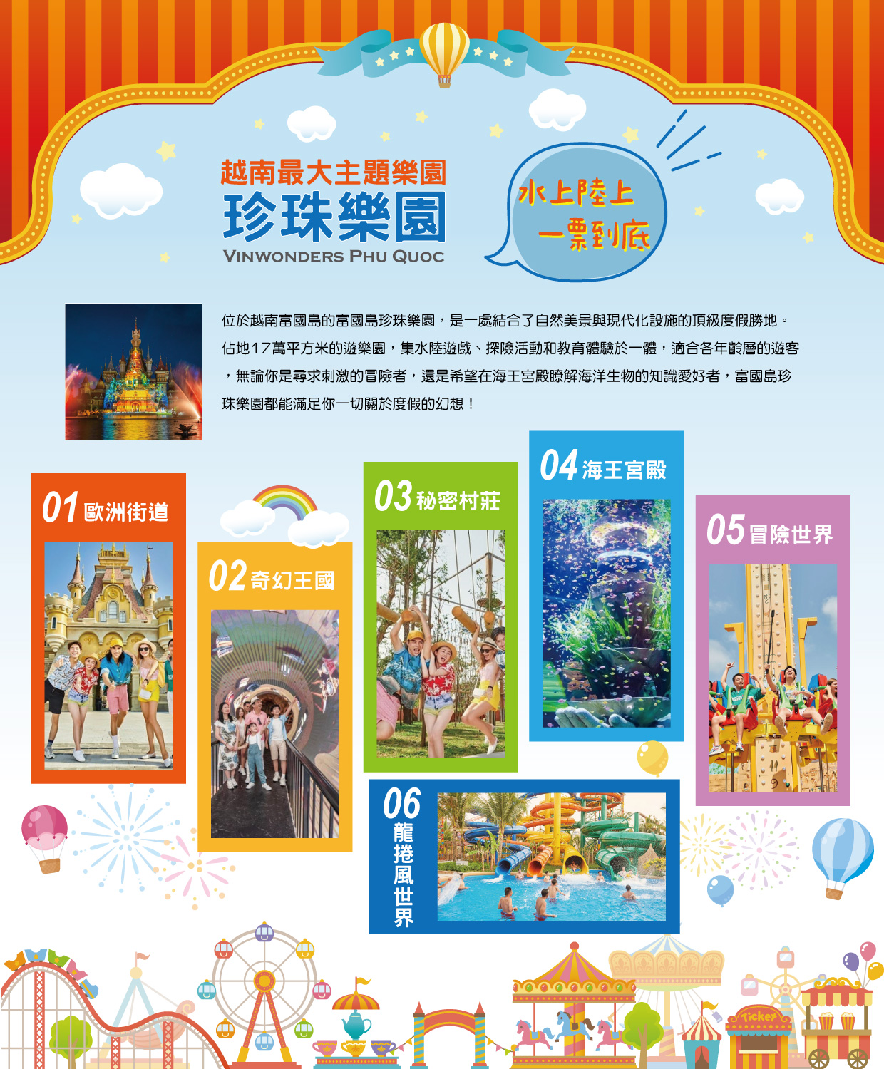 【Vin Wonders珍珠島主題樂園】擁有超豐富的遊樂設施和主題體驗,適合所有年齡段的遊客!你可以挑戰超刺激的雲霄飛車、叢林滑索,感受速度與冒險的快感;在水世界享受浪花池、高速滑道和漂流河的清涼樂趣;探索神秘的熱帶叢林與動物園區,近距離觀賞奇異生物;還能在夢幻城堡中體驗高科技的4D互動遊戲。