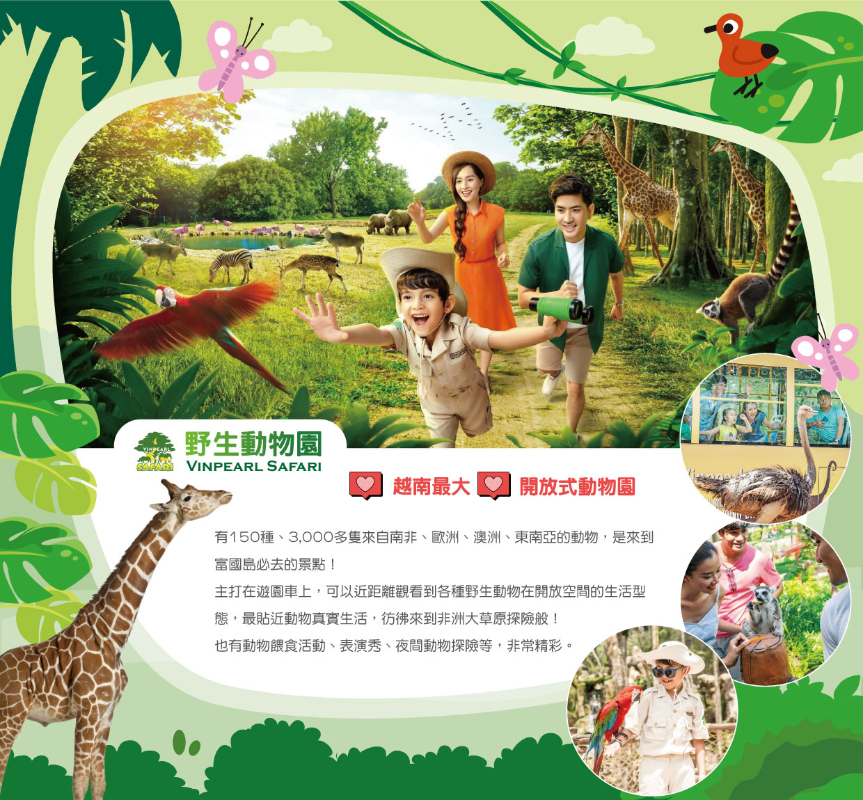 【Vinpearl Safari 野生動物園】是一個與大自然親密接觸的奇妙之地,帶你穿越各種自然環境,體驗野生動物的原始生活!在這裡,你可以坐上專門的遊覽車,穿越草原、熱帶雨林與沙漠區,近距離觀察猛獣如獅子、老虎,還有高大的長頸鹿、優雅的斑馬在自然棲息地中的悠閒生活。
