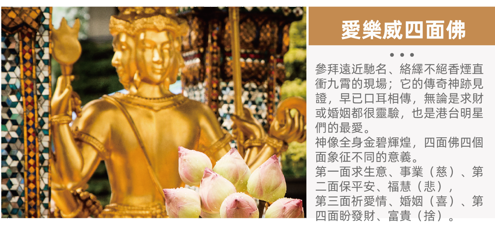 【四面佛】祈福虔誠遠近馳名的【愛樂威四面佛ERAWAN】,即是印度教三位一體神中的創造神-大梵天,所以該稱之為四面神,而非四面佛。四面神有四個面,四雙手和一雙脚,有脚的即是正面,從正面以順時針方向算起四個面分別代表:平安(手持佛珠)、事業(手持權杖)、婚姻(手持貝殼)、財富(手持金磚);也分別代表慈、悲、喜、捨四個字。